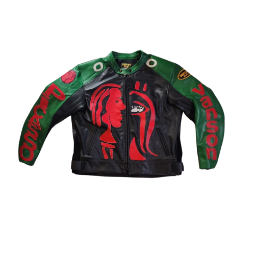 Introducing The Kiss Collection Leather Jacket and Gloves Set in Black / Red / Green, a bold race leather jacket from The Kiss Collection by Black Picasso x Vanson. Designed by Black Picasso and engineered by Vanson Leathers, this set fuses art, race leather, and street culture into one silhouette. Handcrafted in Massachusetts from 100 percent leather, it features sculptural face artwork on the front and a star emblem on the back that turns a classic moto profile into a moving canvas. Cut in a unisex fit, it is built to mold to the wearer and stand out in any room.